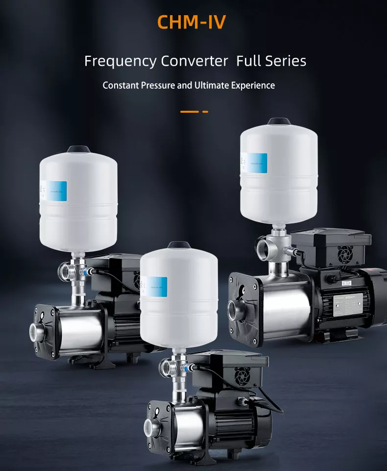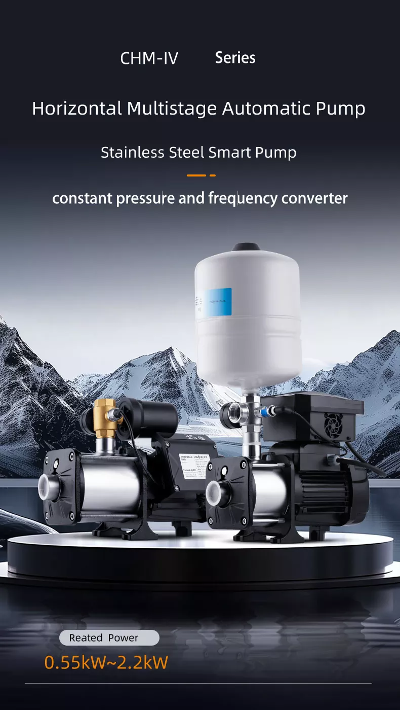 CHM20/IV-sarjan älykäs invertterisarjan vaakasuuntainen ruostumattomasta teräksestä valmistettu monivaiheinen keskipakopumppu on tällä hetkellä markkinoilla oleva suhteellisen kypsä tuote, jolla on kompakti rakenne ja vakaa toiminta, alhainen toimintamelu, hyötysuhde jopa 44-70%. Kaikki vettä läpäisevät komponentit on valmistettu ruostumattomasta teräksestä AISI304. Sitä käytetään laajasti