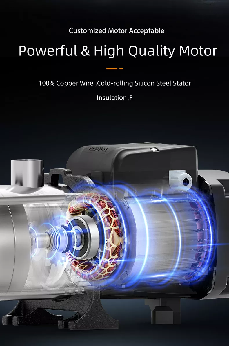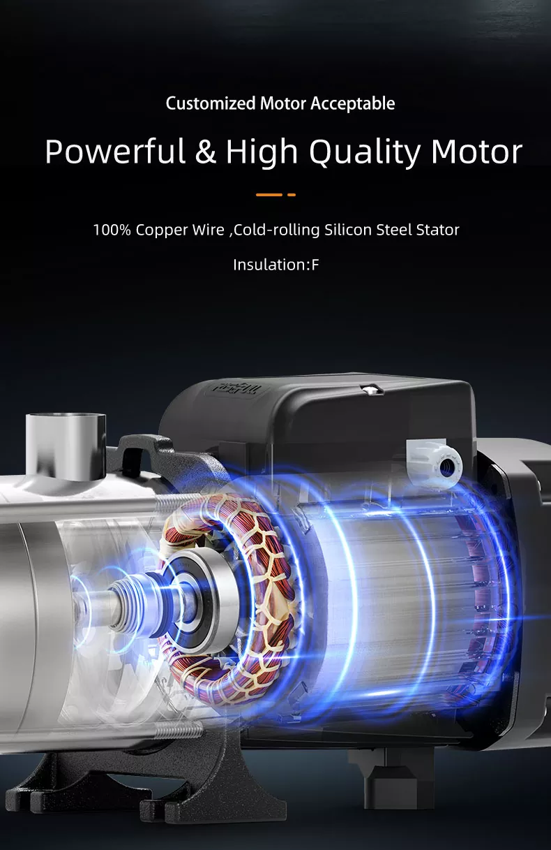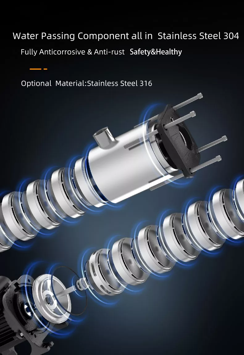CHM8/IV-sarjan Smart Inverter -sarjan vaakasuora ruostumattomasta teräksestä valmistettu monivaiheinen keskipakopumppu on tällä hetkellä markkinoilla suhteellisen kypsä tuote, jolla on kompakti rakenne ja vakaa työ, alhainen toimintamelu, eatointi jopa 44-70%. Kaikki veden kulkevat komponentit on valmistettu ruostumattomasta teräksestä AISI304. Sitä käytetään laajasti
