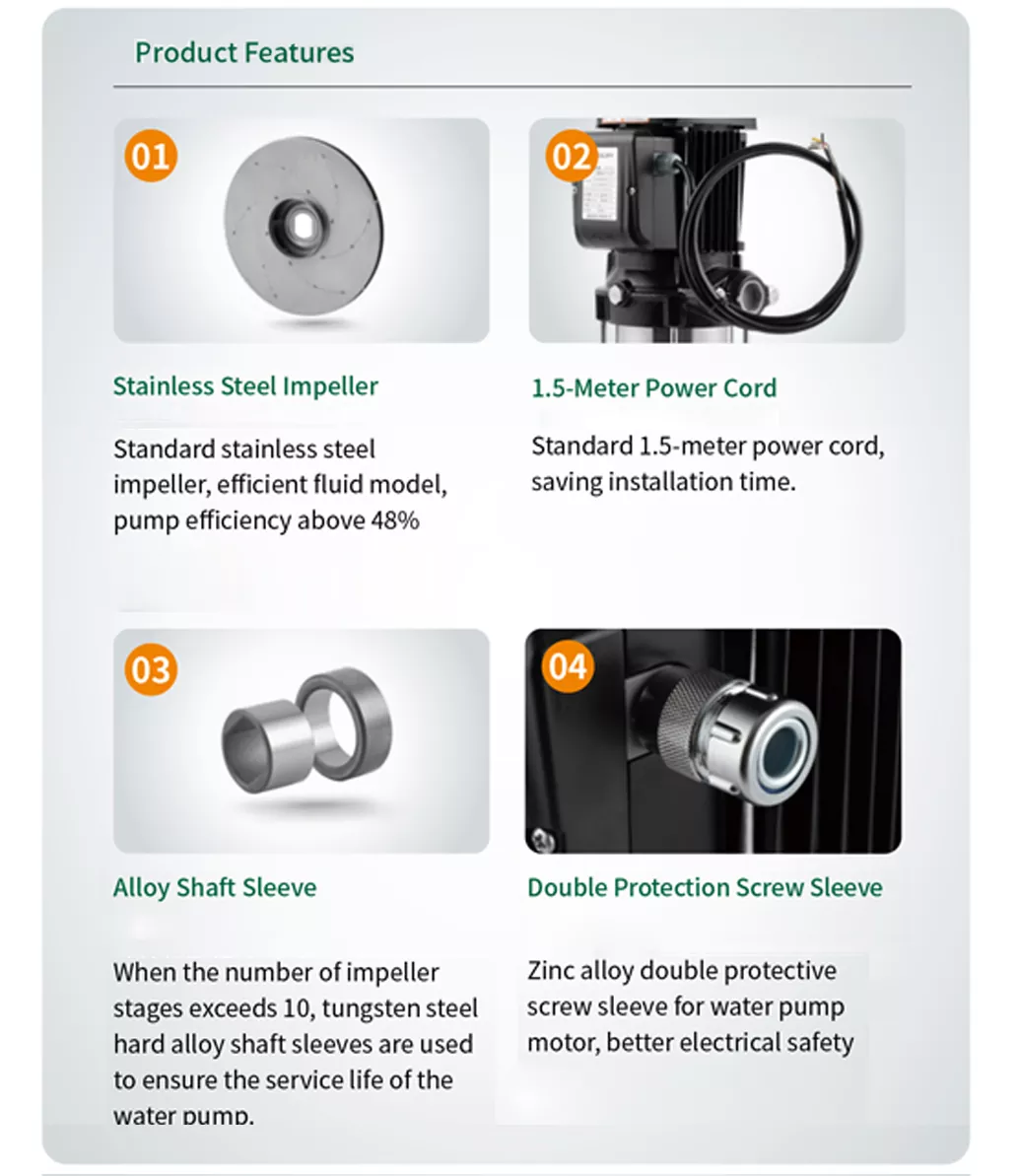 Pumpun päätä voidaan säätää muuttamalla juoksupyörien lukumäärää eri vaatimusten mukaan. Se sopii puhtaalle vedelle tai nesteille, joilla on samanlaiset ominaisuudet, kun taas tietyt mallit voidaan räätälöidä syövyttäville aineille.